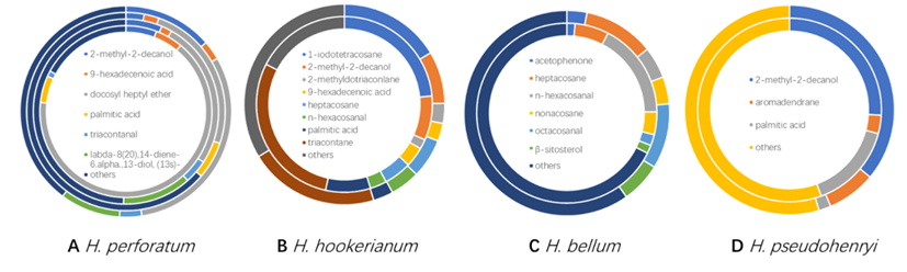 金絲桃屬植物4個種不同部位代表性成分,圓環由內到外排序:(A)貫葉連翹:巫溪種群枝;巫溪種群葉;巫山種群枝;巫山種群葉。(B)短柱金絲桃:枝,葉。(C)美麗金絲桃:枝,葉。(D)北栽秧花:枝,葉。