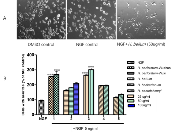 金絲桃屬植物揮發油促神經細胞PC12分化活性。(A) PC12細胞形態變化,分別為0.1% DMSO,細胞生長因子NGF (5 ng/ml),和NGF (5 ng/ml) +美麗金絲桃H. bellum(50 mg/ml)處理。(B)神經突生長細胞統計,以與NGF對照組百分比定量。***p < 0.001與NGF組相比。