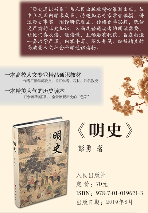 據(jù)悉,《明史》一書是人民出版社重點打造的“歷史通識書系”的第一部,該書系邀請國內(nèi)知名學者撰稿,努力打造歷史通識精品圖書。據(jù)《明史》(后記)的介紹,該書既是彭勇老師三十年從事明清史學習和研究的所得所獲,也充分吸收了學術(shù)界的研究成果和動態(tài);希望既能對初涉專業(yè)歷史研究者有所幫助,也希望給廣大明史愛好者以專業(yè)上的指導。