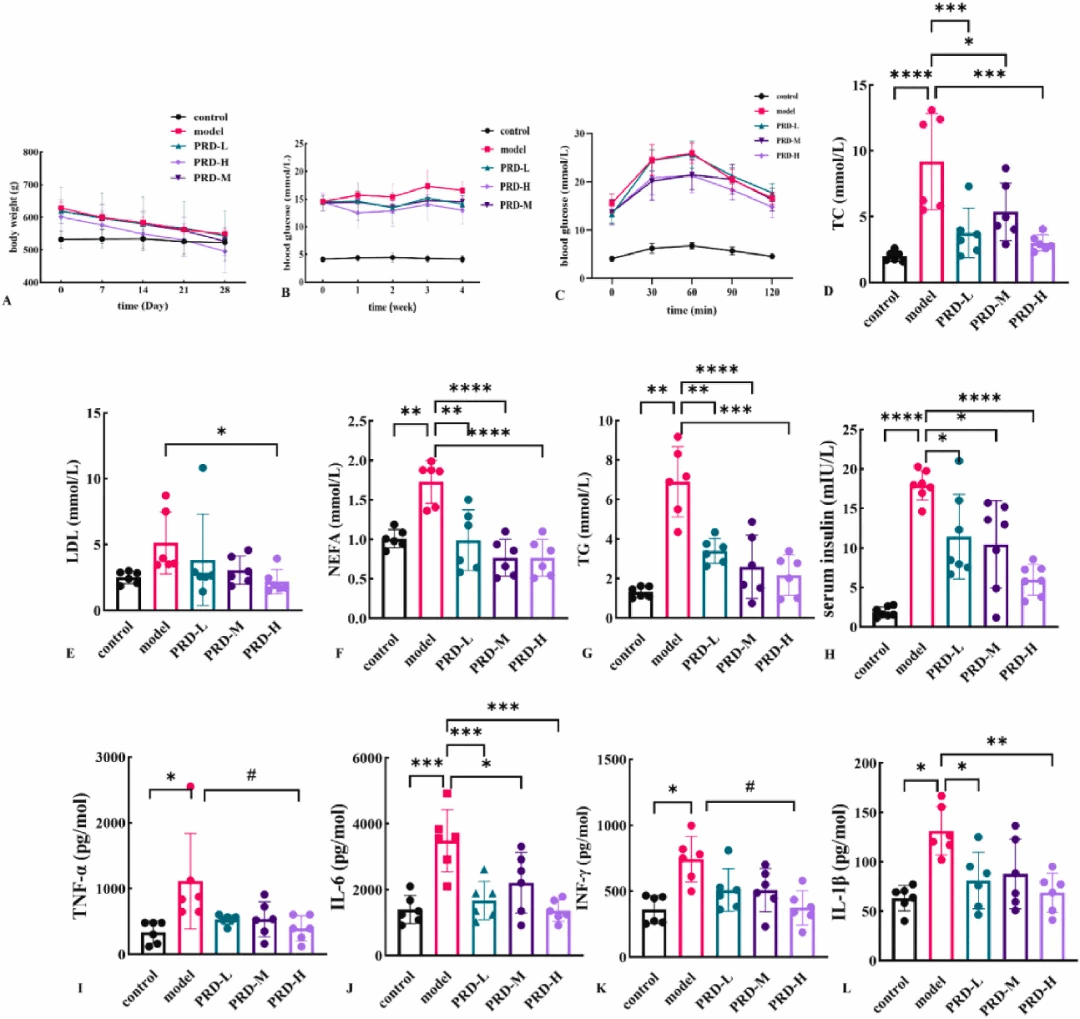 該團隊在藥理學專業期刊Journal of Ethnopharmacology上發表了題為“PuRenDan alleviates type 2 diabetes mellitus symptoms by modulating the gut microbiota and its metabolites”的最新成果。中藥菩人丹(PRD)由苦瓜、人參、丹參、葛根和炙首烏五味藥物組成。課題組前期研究表明,PRD可以降低大鼠的胰島素抵抗和血糖水平,增強胰腺血流,改善胰島β細胞結構與功能。然而,其治療T2DM的主要機制尚不清楚。
