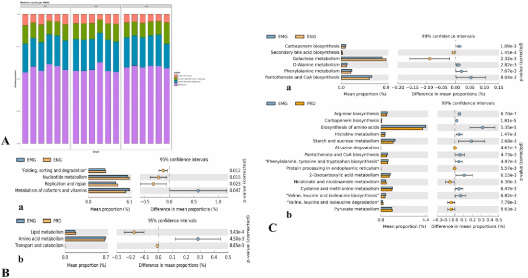 在本次研究中,研究者通過建立大鼠2型糖尿病模型,發現PRD治療后大鼠血糖水平顯著下降,同時有效改善了血脂異常、胰島抵抗和炎癥反應。通過宏基因組分析,研究者發現菩人丹顯著改善了腸道微生物的豐度,改變了多種微生物的含量。進一步分析表明,與PRD治療關系最密切的物種包括P.sp 10 (H)、Pa. sp SN4 等。KEGG分析顯示,PRD組的脂肪代謝、轉運和分解代謝顯著富集,而糖尿病組富集氨基酸代謝。此外,采用基于UHPLC - QTOF/MS的非靶向代謝組學方法,研究者發現PRD降低了包括苯甲酸、膽酸等在內的29種代謝產物的水平。