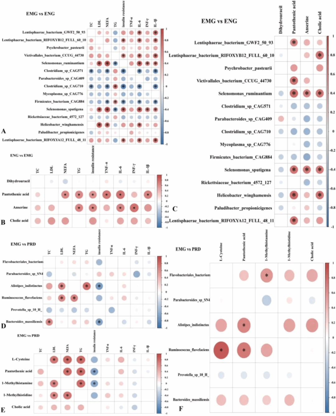 綜合研究結果表明,來自厚壁菌門的黃色鏈球菌R.flavefaciens和來自擬桿菌門的A.indistinctus在與PRD結合時,通過影響泛酸和輔酶A生物合成途徑中泛酰胺酸和L-半胱氨酸對T2DM產生潛在作用,改善了與2型糖尿病相關的血脂水平、胰島素抵抗和炎癥。