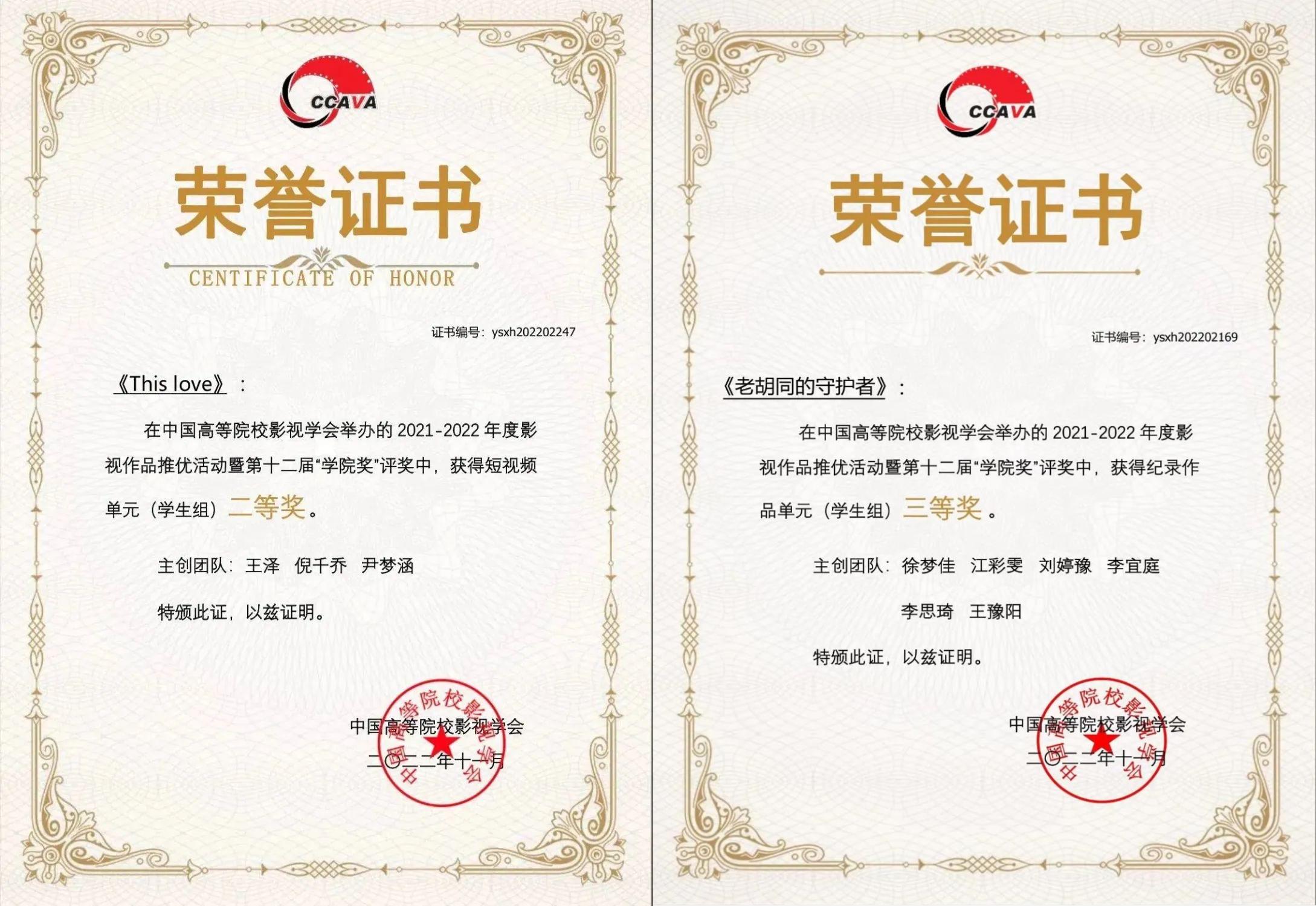 新聞與傳播學院本科生王澤、林映雪、盧心怡、龍官浩、倪千喬、尹夢涵等共同創作的《This love》榮獲“學院獎”學生組短視頻單元二等獎。碩士研究生徐夢佳、江彩雯、劉婷豫、李宜庭、李思琦、王豫陽等共同創作的《老胡同的守護者》榮獲“學院獎”學生組紀錄作品單元三等獎。