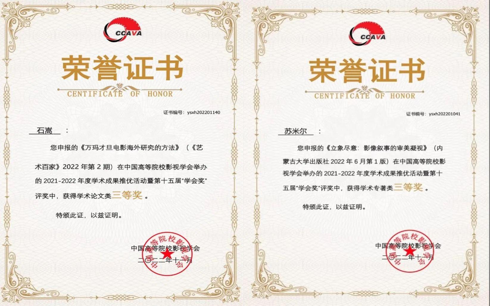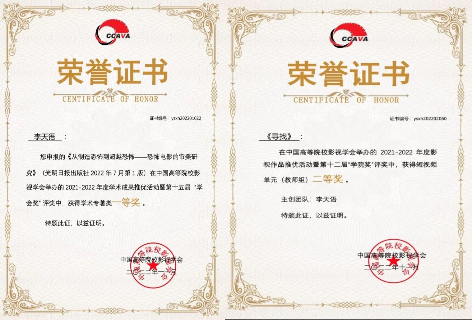 教師作品李天語《從制造恐怖到超越恐怖:恐怖電視的審美研究》榮獲“學會獎”學術專著類一等獎,《尋找》獲“學院獎”教師組短視頻單元二等獎。石嵩《萬瑪才旦電影海外研究的方法》獲“學會獎”學術論文類三等獎。蘇米爾《立象盡意:影像敘事的審美凝視》獲“學會獎”學術專著類三等獎。