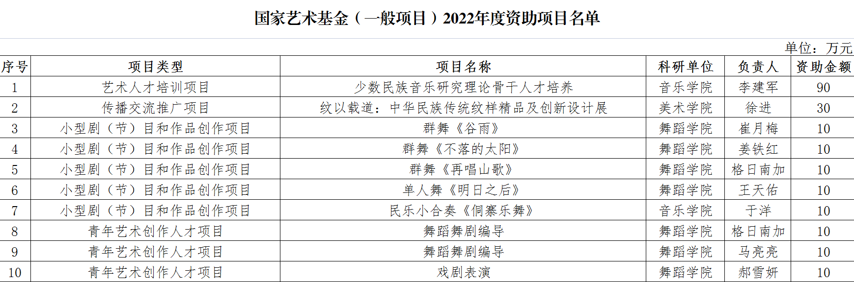 新聞網訊 近日,根據國家藝術基金管理中心公布的2022年度國家藝術基金立項情況,本年度國家藝術基金共評選資助項目600余項,我校獲得10項資助。其中舞蹈學院7項、音樂學院2項、美術學院1項,立項率達到12.8%,遠超本年度國家藝術基金5.7%的立項率。
