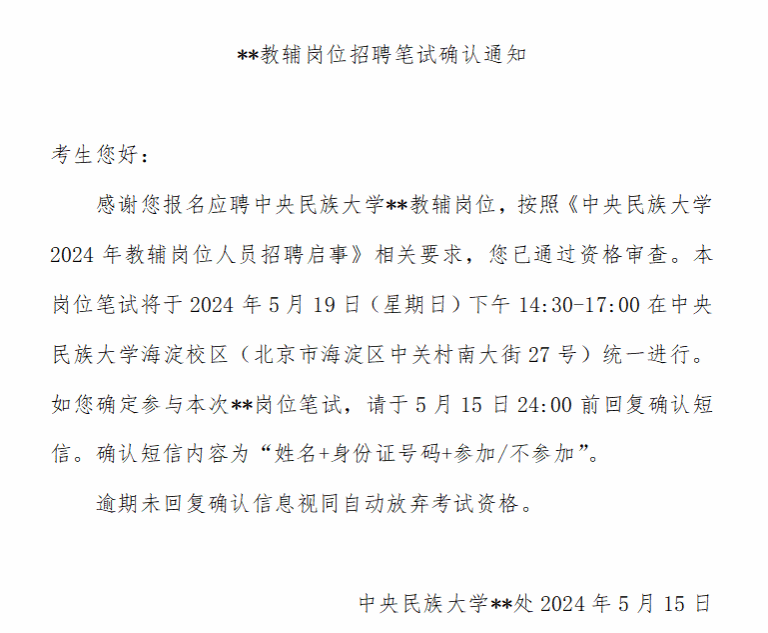 通過資格審查人員將于2024年5月15日下午15:00收到統(tǒng)一短信通知,內容如下圖: