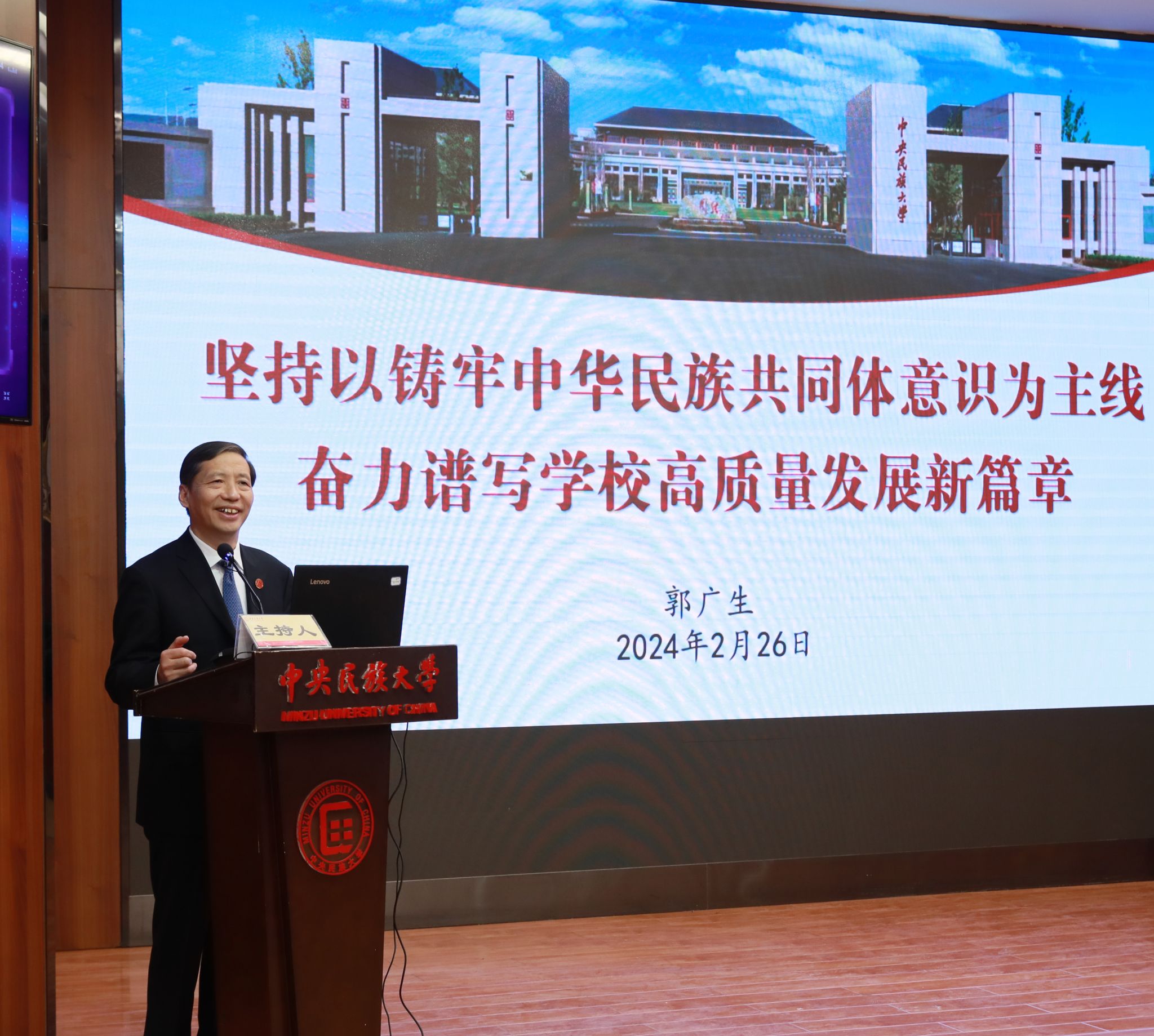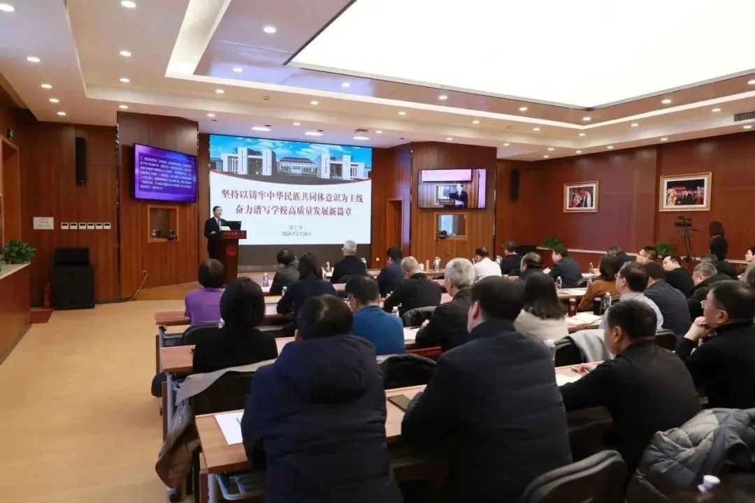 郭廣生指出,2024年是中華人民共和國成立75周年,是實現“十四五”規劃目標任務的關鍵一年,更是學校聚焦“鑄牢”主線深化改革、推動高質量發展的關鍵一年。要深入貫徹落實習近平總書記關于加強和改進民族工作的重要思想,堅持和加強黨的全面領導,堅定擁護“兩個確立”、堅決做到“兩個維護”;要聚焦服務強國建設和“鑄牢”主線,統籌深入推進國家“雙一流”和北京市新一輪“雙一流”建設,實現更高質量發展;要堅持把深化改革作為根本動力,不斷激發干部教師干事創業活力,形成共促學校事業高質量發展合力;要堅持把維護安全穩定作為根本前提,筑牢政治安全防線、管好校園安全、及時化解矛盾糾紛,防范各領域風險隱患。