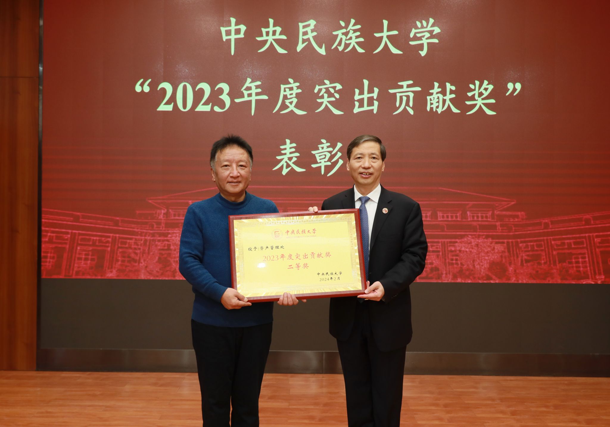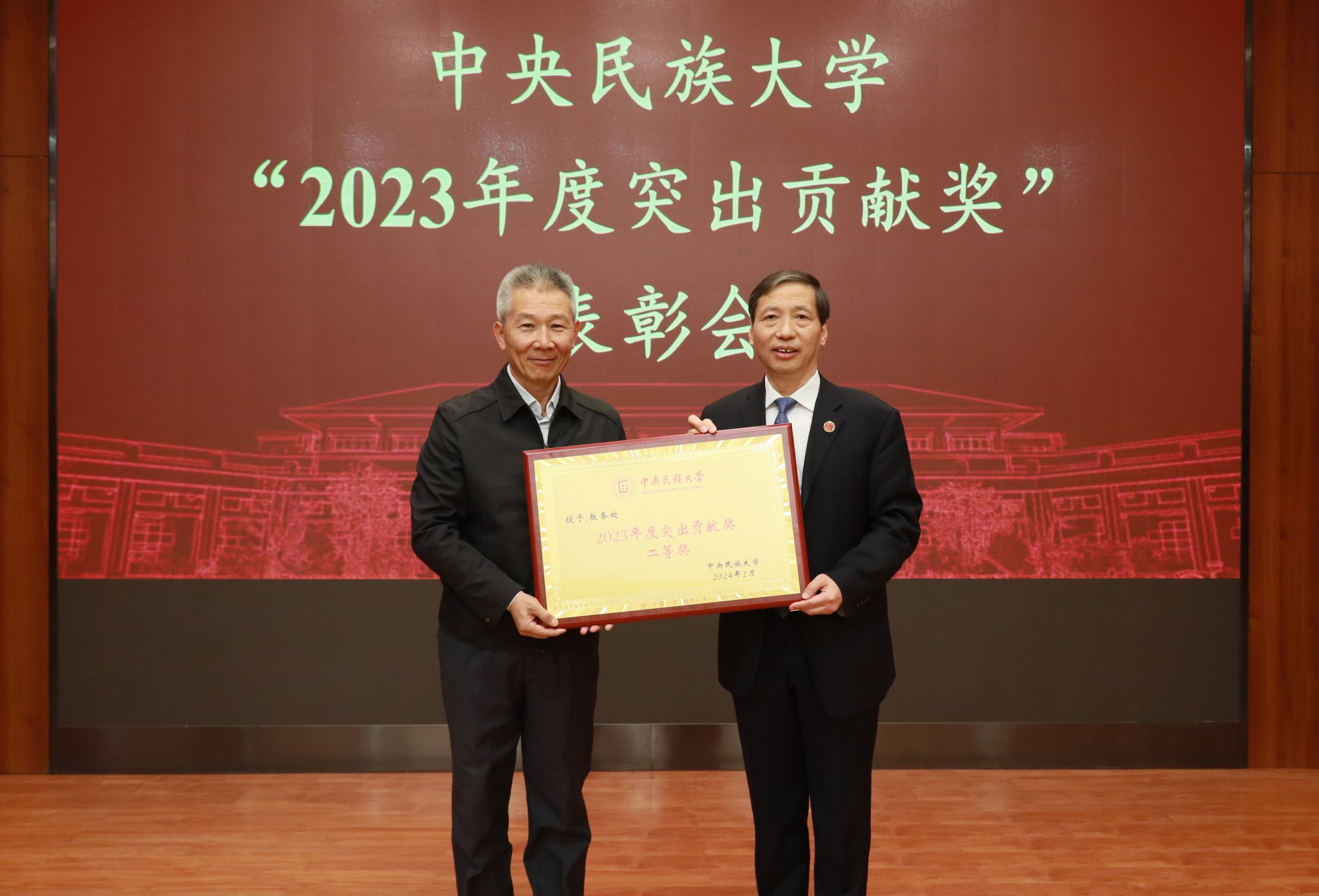 2023年,全校師生深入貫徹落實習近平新時代中國特色社會主義思想和黨的二十大精神,堅持以鑄牢中華民族共同體意識為主線,圍繞“立德樹人”根本任務,深化改革、開拓創新,有力推動了學校“雙一流”建設,特別是在人才培養、民生工程等方面取得了突出成績,為學校事業發展作出了重要貢獻。校黨委常委、副校長楊慕云宣讀《中央民族大學關于授予教務處、資產管理處2個集體“2023年度突出貢獻獎”的決定》,郭廣生為獲獎集體頒獎。