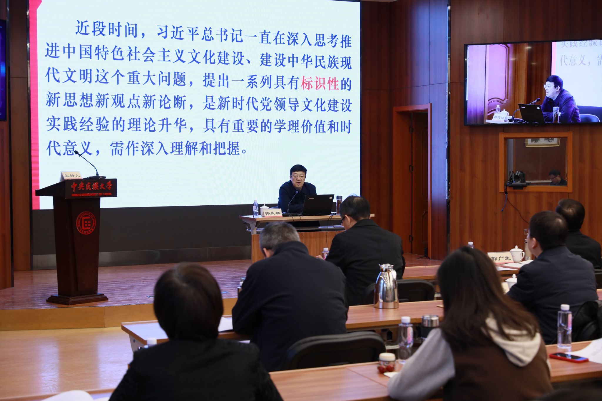 新聞網訊 為深入學習貫徹習近平新時代中國特色社會主義思想,特別是習近平總書記關于加強和改進民族工作的重要思想和習近平文化思想,貫徹落實委黨組重點工作任務,加快推進新學期重點工作任務,為學校事業轉型升級和高質量發展凝聚力量,2月25日上午,學校在知行堂召開第十二期新學期干部培訓班,進一步凝聚思想共識,激發奮進力量。首場報告邀請國家哲學社會科學一級教授,第十三屆全國政協委員,中共中央黨校(國家行政學院)原校委委員、副教育長韓慶祥以《習近平文化思想與新的文化生命體》為題作專題報告。報告會由校黨委副書記鄒吉忠主持。