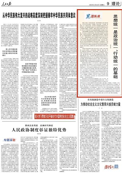 新聞網訊 3月22日,《人民日報》理論版“思想縱橫”欄目刊發我校黨委副書記鄒吉忠文章《思想統一是政治統一、行動統一的基礎》,文章指出,新征程上,我們要堅持不懈用習近平新時代中國特色社會主義思想凝心鑄魂,以思想統一確保全黨政治團結、行動一致,齊心協力以中國式現代化全面推進強國建設、民族復興偉業。全文內容如下: