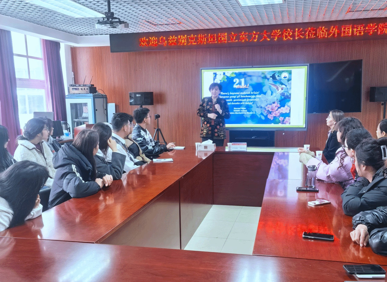 來訪期間,利赫希耶娃為我校俄語—烏茲別克語班學生作了題為《烏茲別克語在烏茲別克斯坦的地位、意義和政策》的講座,并與學生進行了關于烏茲別克斯坦文化、語言方面的交流。