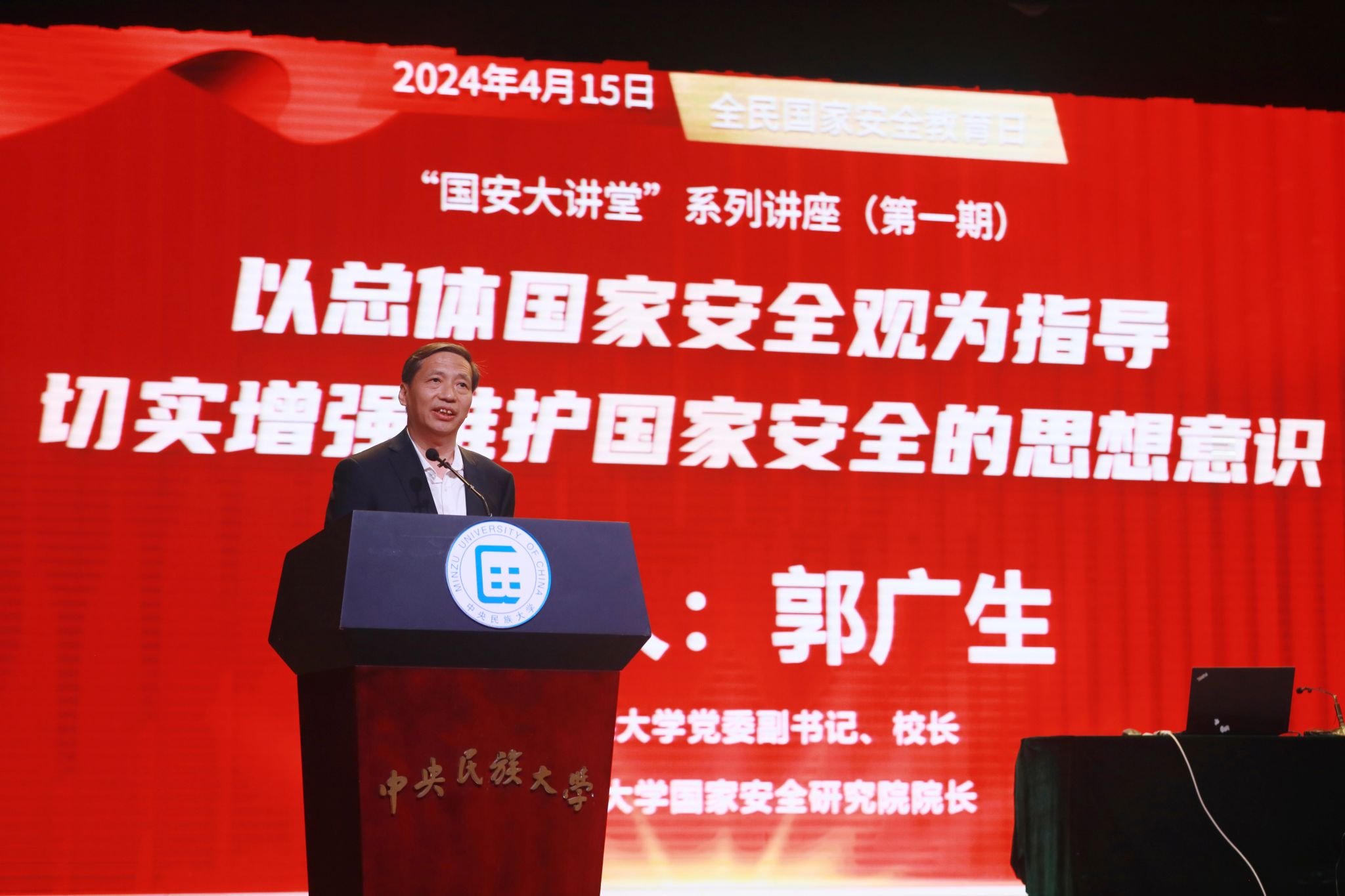 新聞網訊 今年是習近平總書記提出總體國家安全觀10周年。4月15日,第9個全民國家安全教育日當晚,中央民族大學“國安大講堂”系列講座正式開講。中國人民公安大學原黨委書記、校長程琳教授在海淀校區大禮堂為中央民族大學師生作題為“以總體國家安全觀為指導 切實增強維護國家安全的思想意識”的專題講座。講座由校黨委副書記、校長,國家安全研究院院長郭廣生主持。