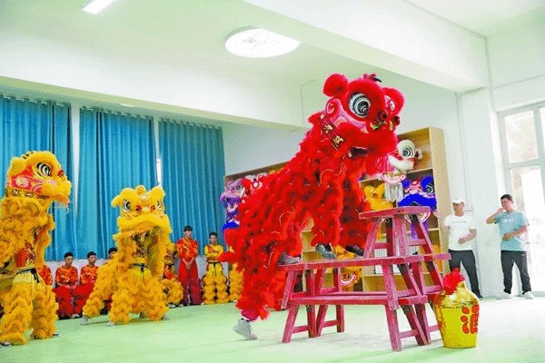 ▲“醒獅公開課”上,疏附縣第一中學舞獅隊進行醒獅表演。(圖片來源:新疆日報 林鴻濤攝)