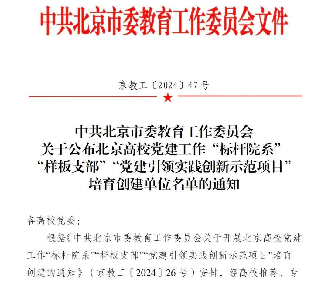 今年以來,學(xué)校黨委深入實(shí)施基層黨建工作質(zhì)量提升工程,將黨建示范創(chuàng)建和質(zhì)量創(chuàng)優(yōu)工作作為黨建工作重點(diǎn)任務(wù),堅(jiān)持以“一融雙高”為重點(diǎn)、對(duì)標(biāo)“五個(gè)到位”創(chuàng)建培育“標(biāo)桿院系”,以打造特色黨支部工作法為重點(diǎn)、對(duì)標(biāo)“七個(gè)有力”創(chuàng)建培育“樣板支部”,繼今年4月入選第四批“全國黨建工作樣板支部”和第三批“百個(gè)研究生樣板支部”后,在北京市“雙創(chuàng)”評(píng)選中再獲佳績。