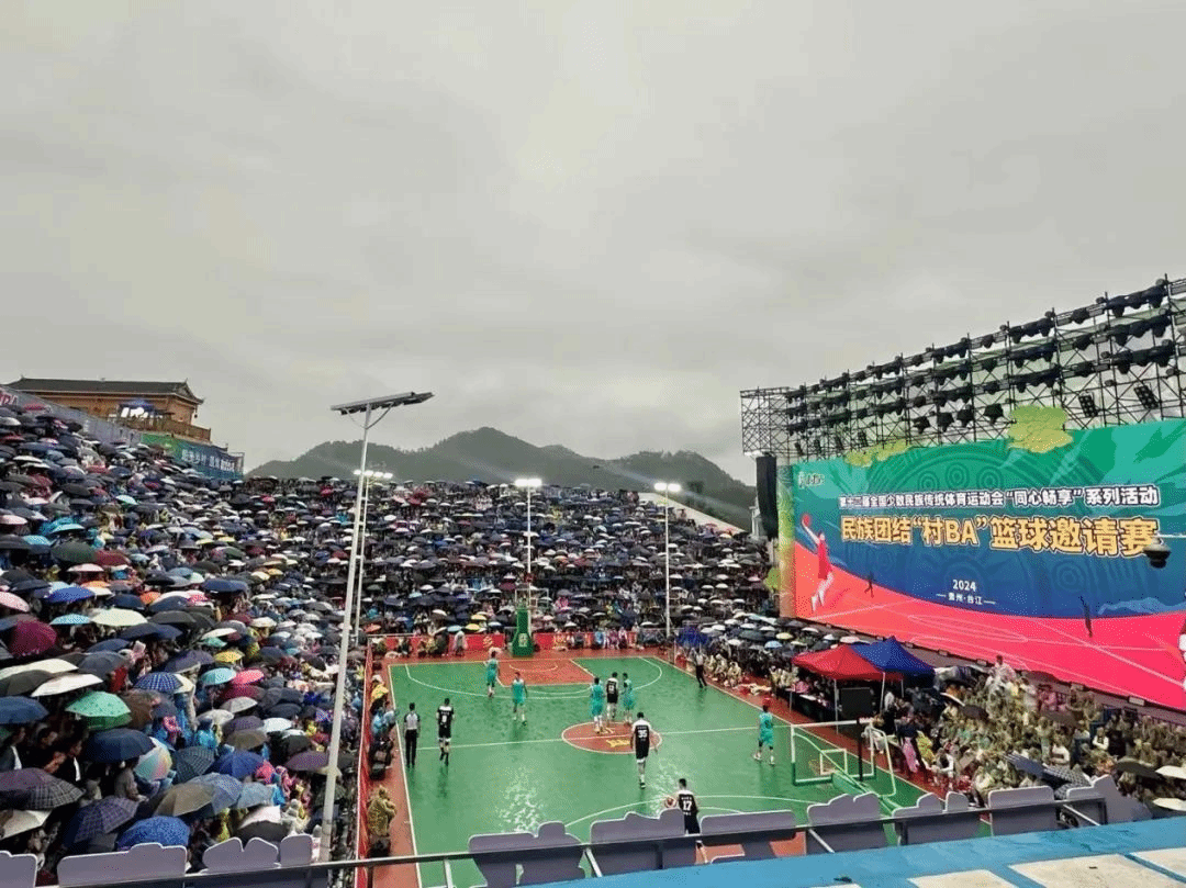 ▲2024年全國(guó)民族團(tuán)結(jié)“村BA”籃球邀請(qǐng)賽期間,雨中的臺(tái)盤(pán)鄉(xiāng)籃球賽場(chǎng)。(圖片來(lái)源:貴州省民宗委)