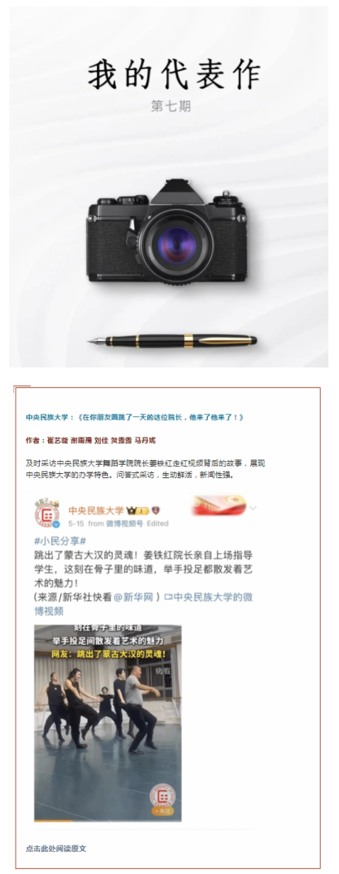 作品《在你的朋友圈跳了一天的這位院長,他來了他來了!》由中央民族大學黨委宣傳部融媒體中心策劃制作,文章以問答式采訪,圖文并茂地報道了學校舞蹈學院院長姜鐵紅身兼“舞者”“師者”雙重身份和“走紅”視頻背后的故事,生動講述了姜鐵紅和學生所跳舞蹈《奔騰》的創作背景以及舞蹈背后鑄牢中華民族共同體意識與傳承中華優秀傳統文化的故事,報道生動鮮活、新聞性強。