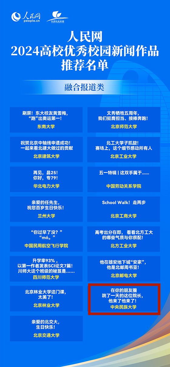 新聞網訊 12月27日,以“推進教育科技人才一體發展 加快建設教育強國”為主題的人民網2024大學校長論壇在北京人民日報社舉行。論壇上,人民網2024年高校優秀校園新聞作品正式公布。中央民族大學官方微信公眾號發布的《在你的朋友圈跳了一天的這位院長,他來了他來了!》一文入選人民網2024年高校優秀校園新聞作品(融合報道類)。