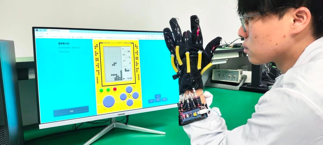 劉星宇小組成員展示如何用光纖手勢識別手套玩游戲之俄羅斯方塊