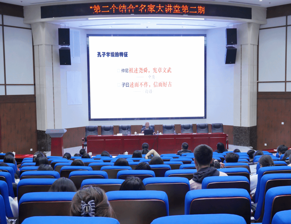 新聞網訊 3月26日晚,由習近平文化思想研究中心中央民族大學協同研究基地、中央民族大學馬克思主義學院主辦的“第二個結合”名家大講堂系列講座第二講,在豐臺校區綜合樓東區報告廳舉辦。全國人大代表、山東大學儒學高等研究院特聘教授、原中國孔子研究院院長楊朝明先生應邀圍繞“從文化自知到文化自信”主題進行現場講授。基地副主任兼秘書長、馬克思主義學院黨委書記兼院長孔新峰為楊朝明先生頒發特聘研究員聘書,頒贈“第二個結合”名家大講堂紀念牌,并主持講座。校內外百余名師生參加現場講座學習。