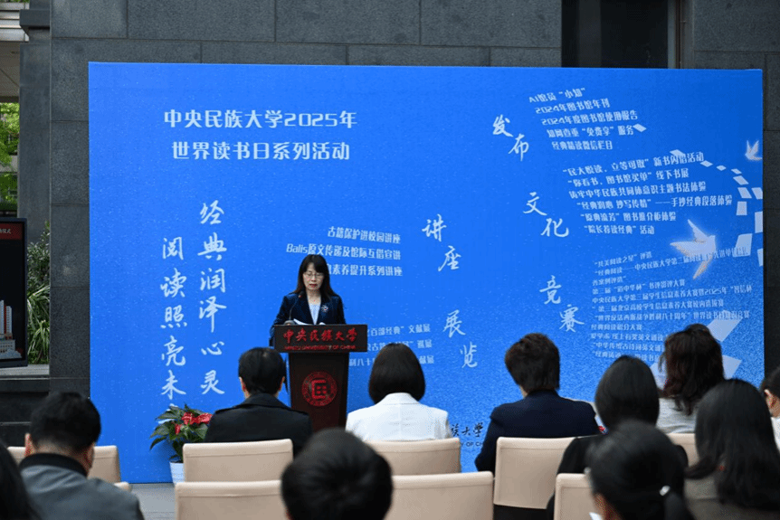 圖書館館長劉明新就本次讀書月6大類的近30個系列活動進行了分類介紹,并宣布中央民族大學2025年世界讀書日“經典潤澤心靈 閱讀照亮未來”系列活動正式啟動。她指出,圖書館堅持使用組合拳的形式開展閱讀推廣工作,秉持經典閱讀為根的理念,堅持以賽促學、文化浸潤、傳承創新,呼吁師生參與,讓經典融入生活、變成習慣,形成良好的閱讀氛圍,不斷鑄牢中華民族共同體意識,推動書香校園建設,擦亮校園文化。