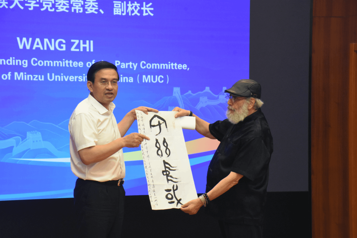 王志在致辭中表示,面對百年未有之大變局,我們比以往更需要聆聽跨越國界的智慧之聲。希望中外青年能從中國政府友誼獎專家的故事中汲取力量,領(lǐng)悟中國發(fā)展密碼,努力成長為兼具中國心與世界眼的棟梁之材,為構(gòu)建人類命運共同體貢獻青春力量。他特別感謝了活動發(fā)起人馬克力文教授,并贈送其“宅茲中國”的銘文書法作品。
