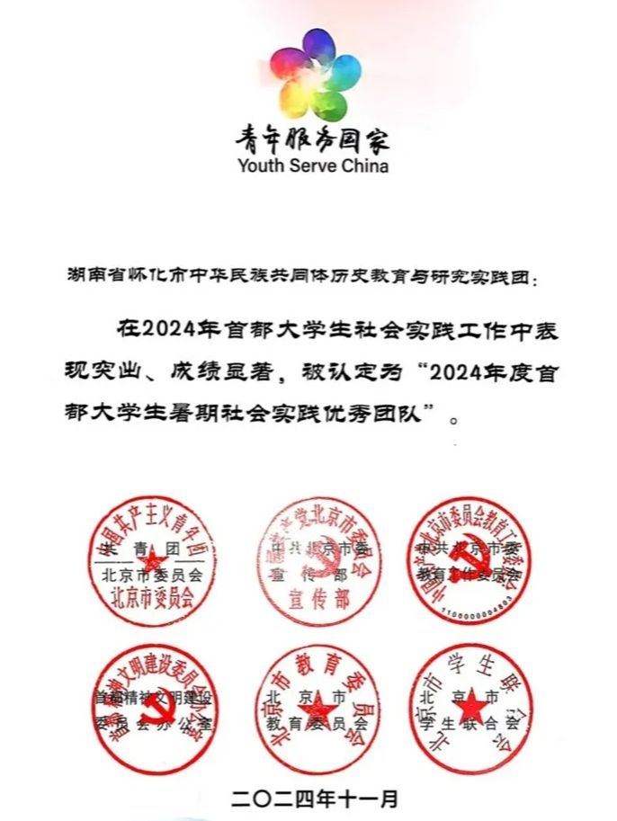 “三交”史實踐團榮獲“2024年度首都大學生暑期社會實踐優秀團隊”