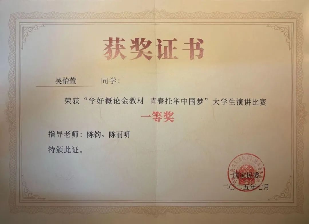 近日,由國家民委主辦,教育部和共青團中央協辦,中央民族大學承辦的“學好概論金教材 青春托舉中國夢”大學生主題演講比賽決賽成功舉辦,吳怡萱以《榫卯相契處 共話“合”之美》為題,從個人實踐經歷出發,結合《中華民族共同體概論》教材內容,生動詮釋全民族共同抗爭的壯闊圖景,最終榮獲本科院校組一等獎。