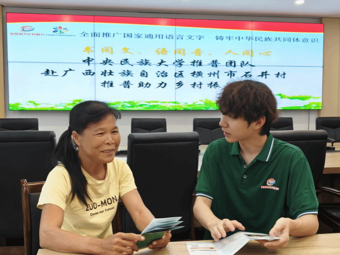 服務隊成員在廣西橫州市石井村開展推普活動,為當地群眾講解推普手冊