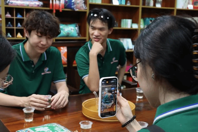 服務隊成員在中華茉莉園用普通話直播宣傳橫州茉莉花
