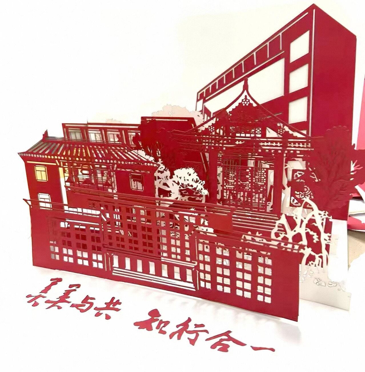 剪紙的鏤空透疊、時(shí)空寫意,借力現(xiàn)代激光雕刻,既能極致復(fù)刻紋樣精魂,又能凝練勾畫學(xué)校三校區(qū)建筑的獨(dú)特剪影。