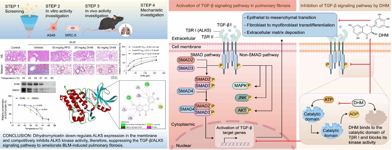針對這一臨床痛點,研究團隊將機器學習技術應用于藥物研發的關鍵環節,高效鑒定、篩選出天然黃酮類化合物二氫楊梅素。該化合物提取自顯齒蛇葡萄藤(俗稱莓茶、藤茶),兼具安全性高與來源廣泛的優勢,為后續研究轉化奠定了良好基礎。團隊在細胞和動物模型中驗證了二氫楊梅素的治療潛力,結果顯示,其在動物體內的療效與現有臨床藥物吡非尼酮相當。在機制層面,團隊發現二氫楊梅素能顯著抑制SMAD依賴和非SMAD依賴的TGF-β信號轉導通路,并首次證實,該化合物通過直接結合I型TGF-β受體(ALK5)的胞內激酶結構域,并下調細胞膜表面的受體表達水平,從而雙向調節TGF-β信號通路,發揮抗肺纖維化作用。